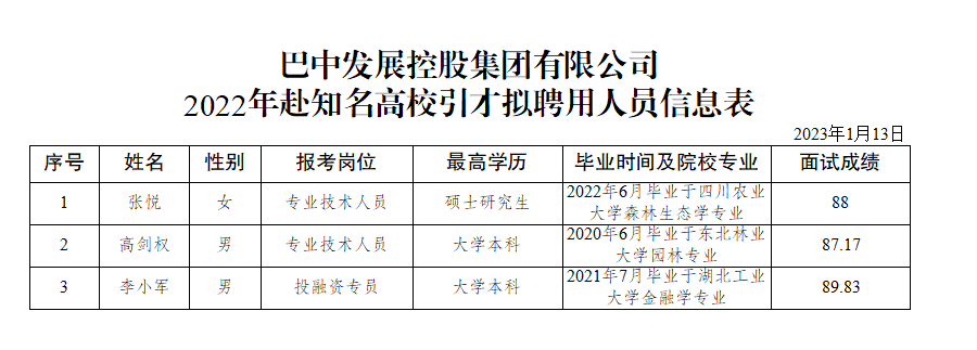 根據(jù)《四川省巴中市2022年赴知名高校引才公告》《巴中市國有資產(chǎn)監(jiān)督管理委員會(huì)關(guān)于印發(fā)<巴中市市屬國有企業(yè)機(jī)構(gòu)設(shè)置和勞動(dòng)用工管理辦法(試行)>的通知》(巴市國資發(fā)〔2020〕67 號)等規(guī)定,經(jīng)網(wǎng)上報(bào)名、資格審查、面試、體檢等程序,現(xiàn)對符合崗位要求的張悅等3名擬聘用人員即日起進(jìn)行公示(詳見附件)。