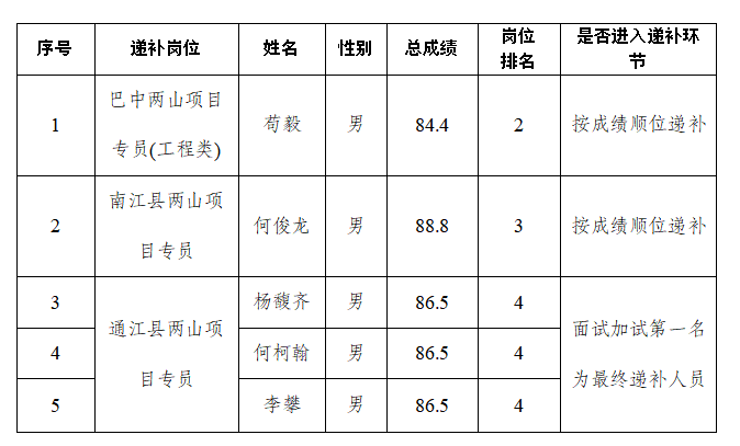 根據(jù)《巴中發(fā)展控股集團有限公司公開招聘工作人員公告》有關(guān)規(guī)定,經(jīng)集團招聘工作領(lǐng)導(dǎo)小組專題會議研究決定,對巴中發(fā)展控股集團有限公司2024年公開招聘工作人員體檢環(huán)節(jié)中出現(xiàn)缺額的崗位按成績進行順位遞補,并對個別崗位考試分數(shù)相同的遞補人員進行面試加試?,F(xiàn)將有關(guān)事項公告如下: